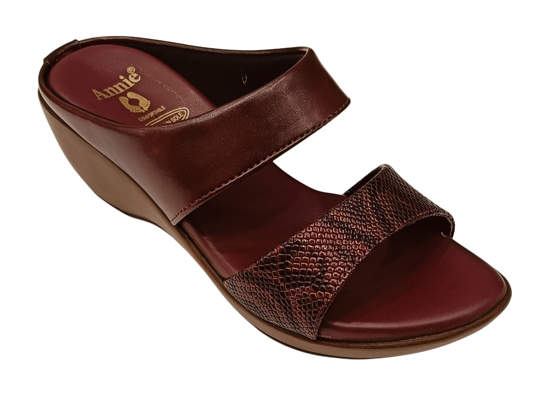 Step into comfort and style with these elegant Annie wedge sandals, perfect for daily wear or casual outings. Featuring a dual-strap design, the upper includes a smooth matte-finish front strap and a textured faux leather band with a subtle snakeskin pattern for a modern twist. The cushioned insole ensures long-lasting comfort, while the moderate-height wedge heel offers support and style in equal measure.