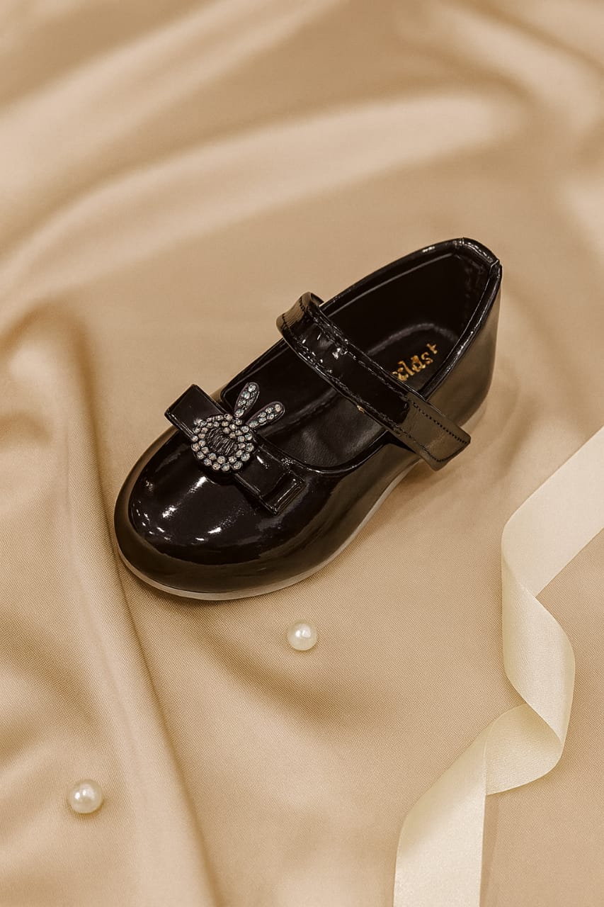 Give your little princess a playful yet elegant look with these glossy ballerina shoes, designed with a cute bunny-shaped rhinestone charm on a satin bow. Available in classic black and pearl white, these shoes bring together comfort and style – perfect for birthdays, weddings, parties, or festive occasions. Featuring a soft cushioned insole and anti-slip sole, they are not just stylish but also practical for all-day wear.