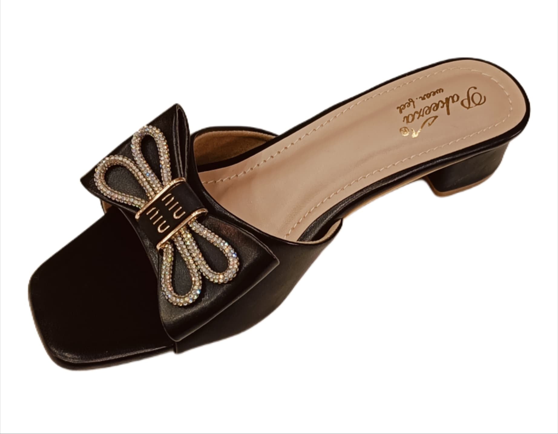 Add a touch of elegance to your footwear collection with these stylish bow-embellished mules, available in both dusty pink and classic black. Designed with a refined square-toe silhouette, these slip-on heels feature a beautifully crafted satin-finish bow adorned with sparkling crystal embellishments and a metallic "Miu Miu" accent centerpiece. The soft cushioned insole and low block heel offer comfort without compromising on glamour, making them perfect for festive events, evening outings, or classy daywear.