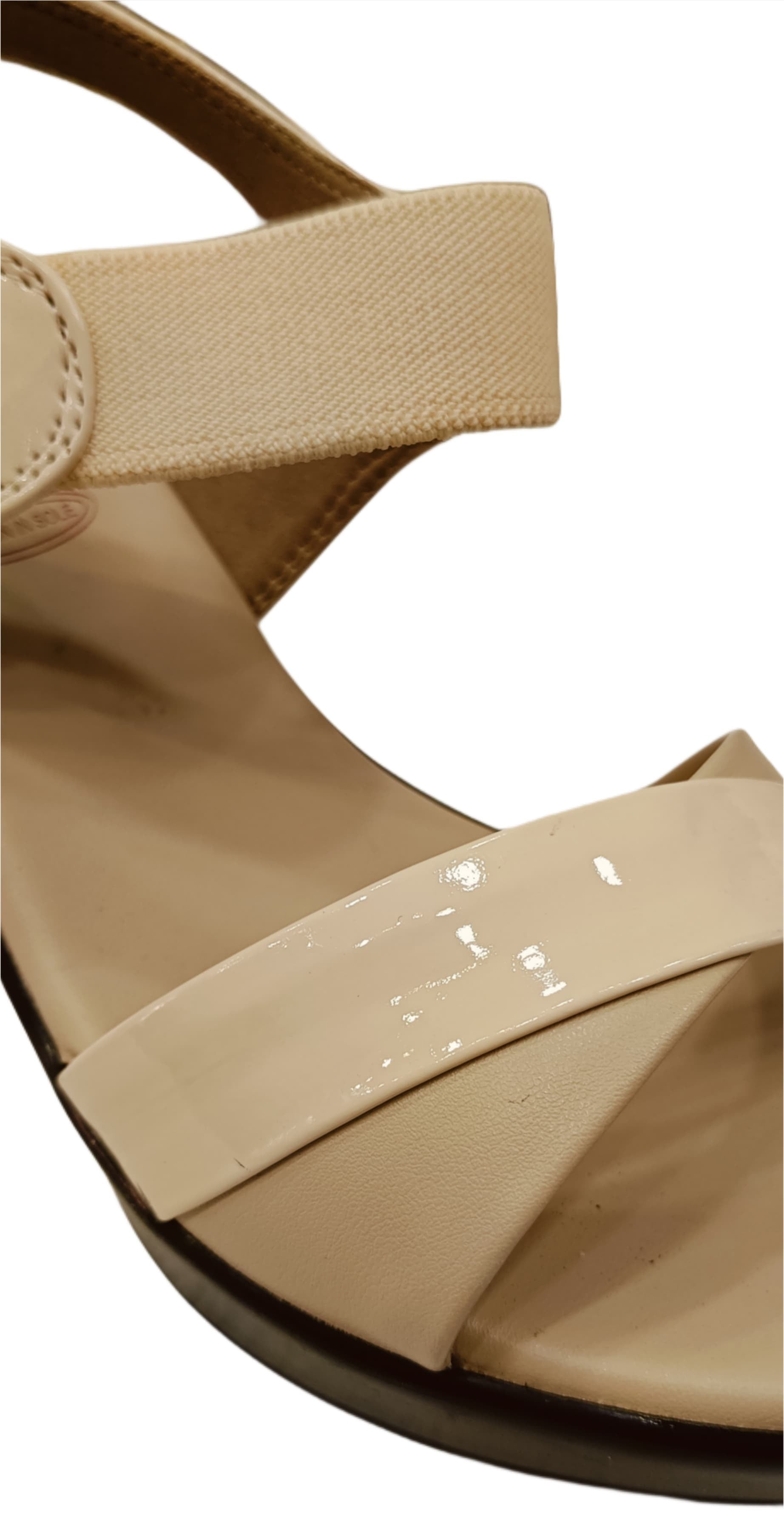 Step into comfort and style with these elegant beige mid-heel sandals. Designed with a sleek patent-finish front strap and a wide elastic ankle strap for a snug yet flexible fit, these sandals are ideal for both casual and semi-formal wear. The sturdy block heel provides a balanced lift, making them perfect for long wear without compromising on comfort. The cushioned footbed adds extra ease to every step.