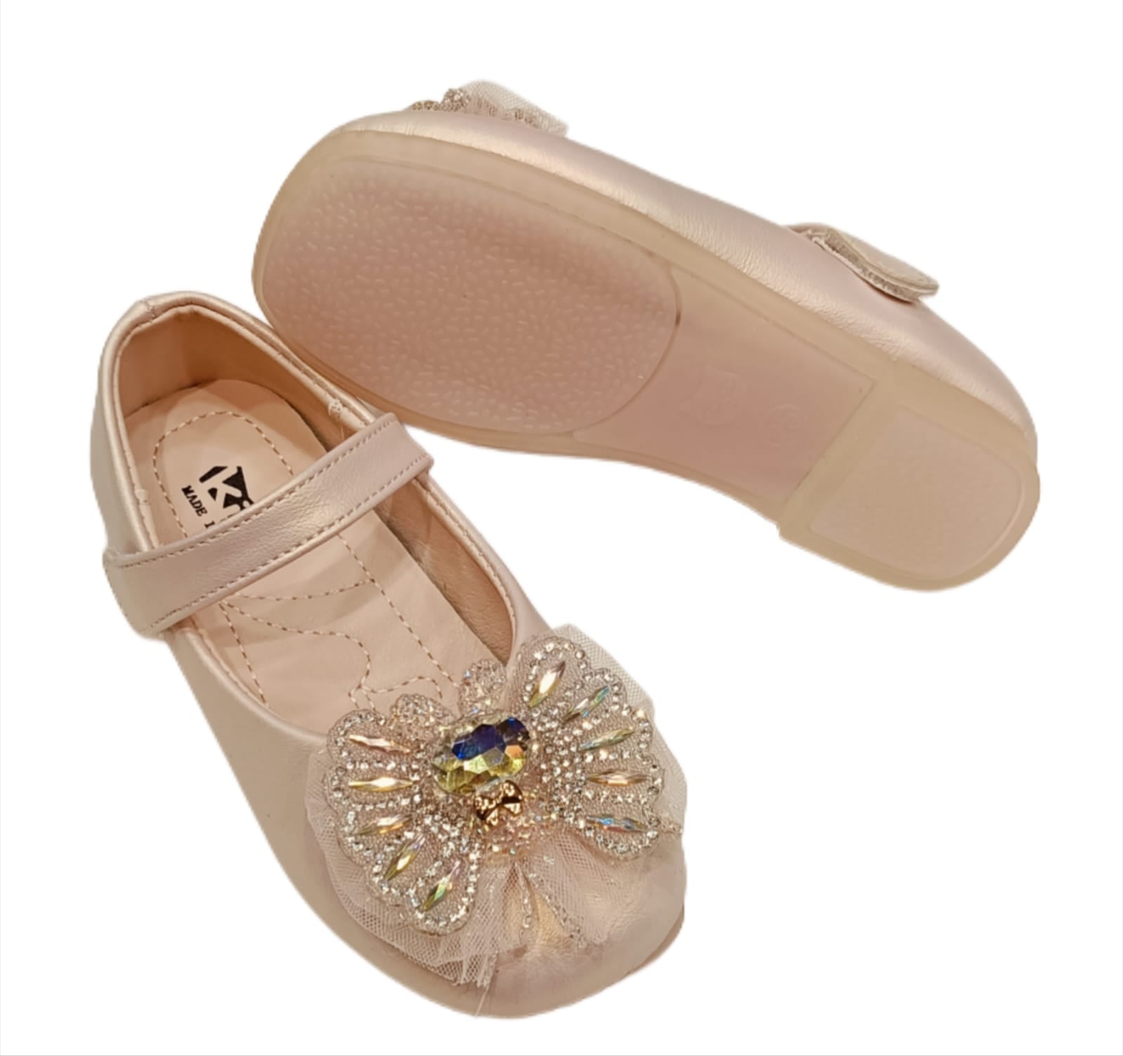 Add a touch of sparkle to your little one’s wardrobe with these charming party wear belly shoes designed especially for girls. Featuring a beautifully embellished butterfly bow with sequin and crystal detailing, these shoes blend glamour with comfort. The secure hook-and-loop strap ensures an easy fit, while the cushioned insole offers all-day wearability. Available in soft pastel tones with a glossy finish, these shoes are perfect for weddings, birthdays, and festive occasions.