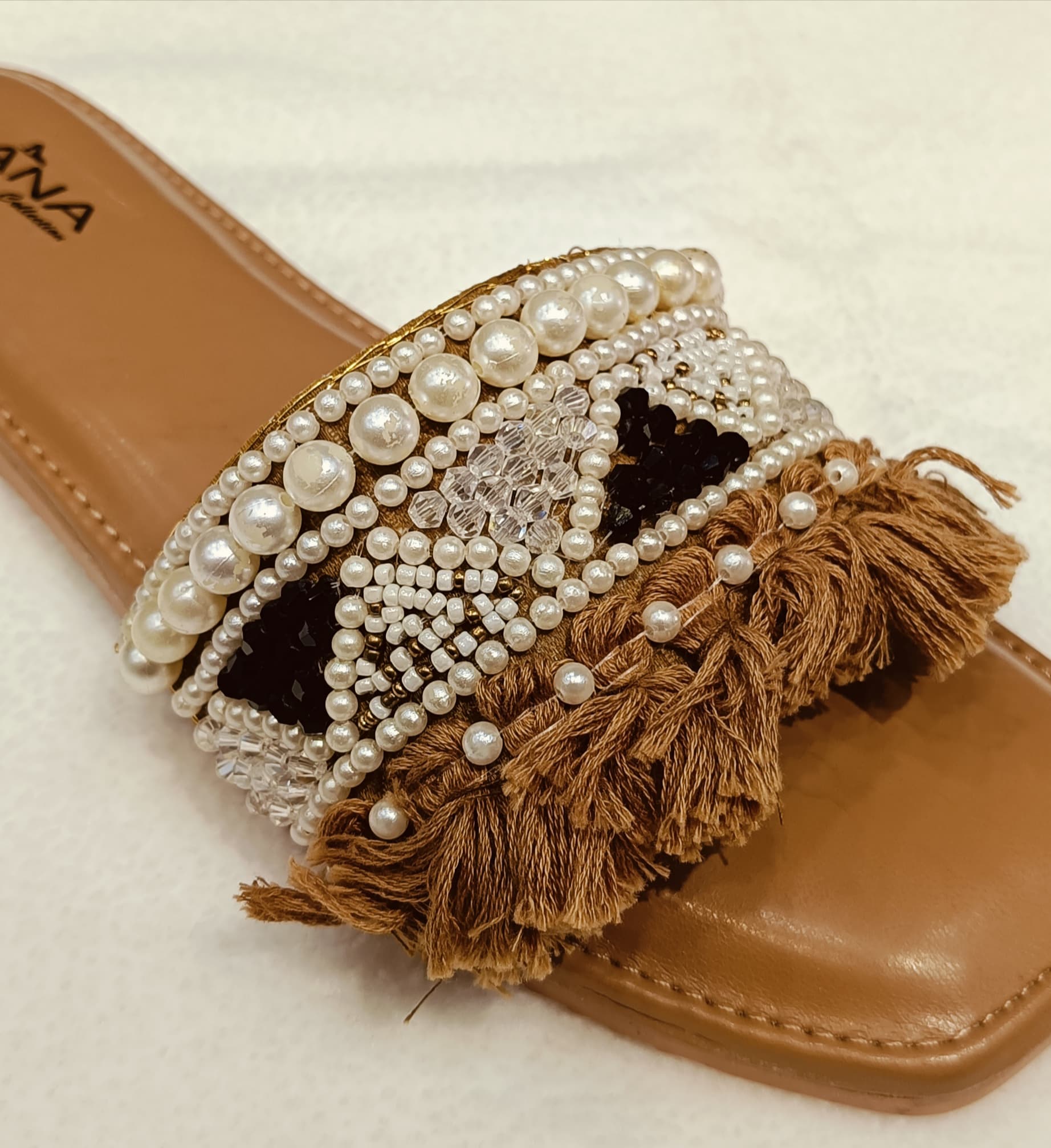 Add a bold and elegant flair to your footwear collection with these handcrafted embellished fringe slides from Diana. These flats are a statement of art and style, featuring intricate beaded patterns, pearl detailing, and tassel fringe accents in multiple elegant color options. Designed with a modern square toe and a cushioned base, these sandals deliver both comfort and eye-catching beauty – perfect for festive wear or upscale casual outfits.