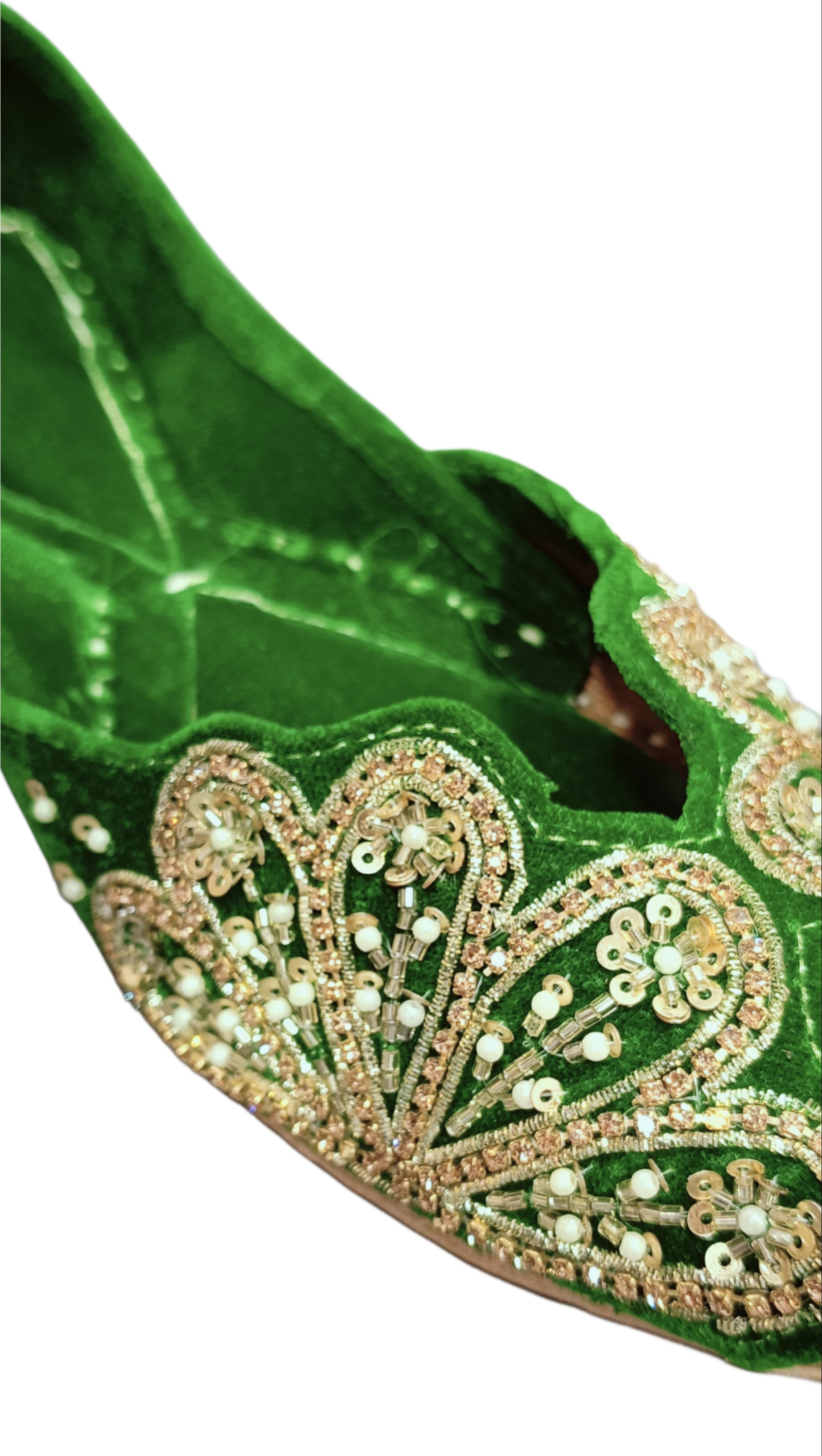 Elevate your ethnic style with this stunning pair of handcrafted traditional juttis. Designed for women who appreciate fine craftsmanship, these juttis feature a vibrant pink fabric base adorned with detailed golden embroidery and sparkling beadwork in an elegant fan-shaped pattern. The open-toe design offers a blend of traditional charm and contemporary flair, making it a perfect addition to your festive or wedding attire.